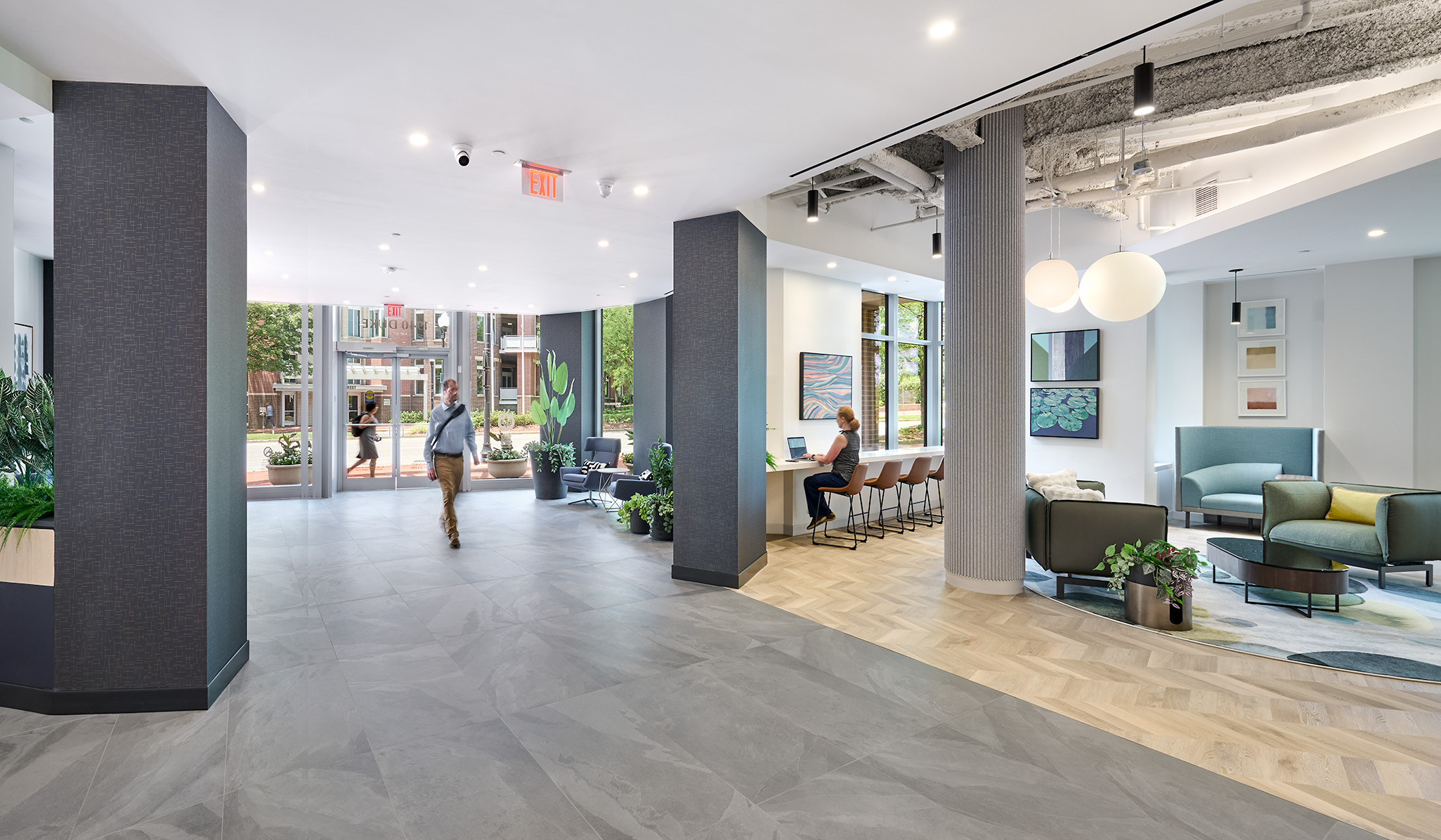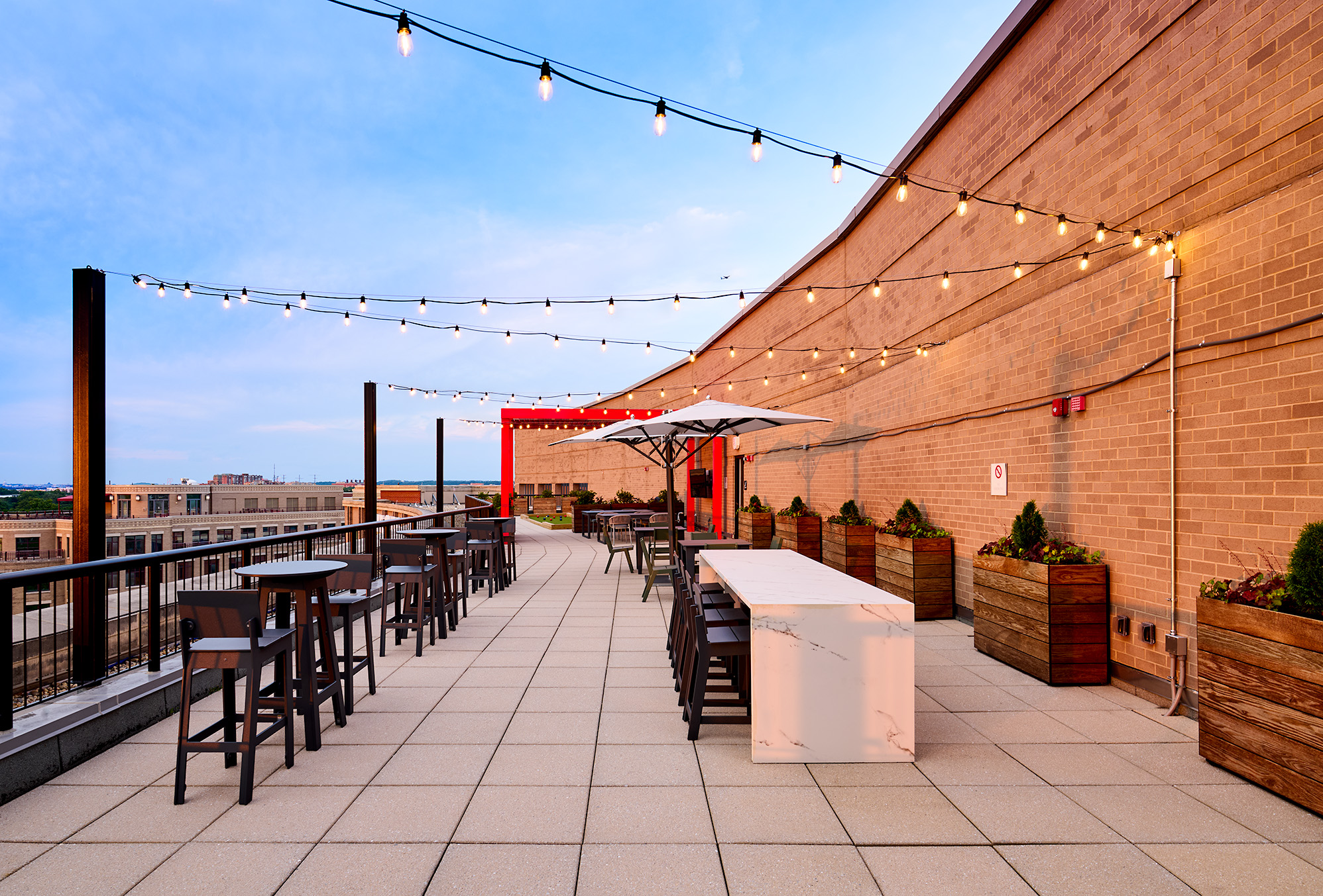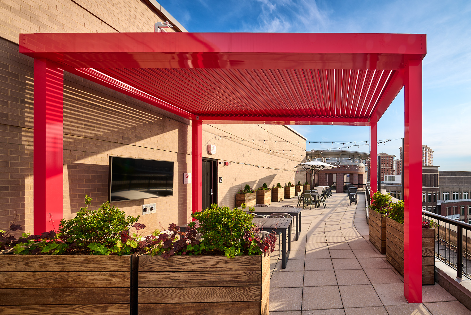 One of the project’s most unique features is the rooftop terrace that includes a bocce court, multiple seating areas, and a bar, all anchored by a bold, red pergola that provides shade and a visual beacon.