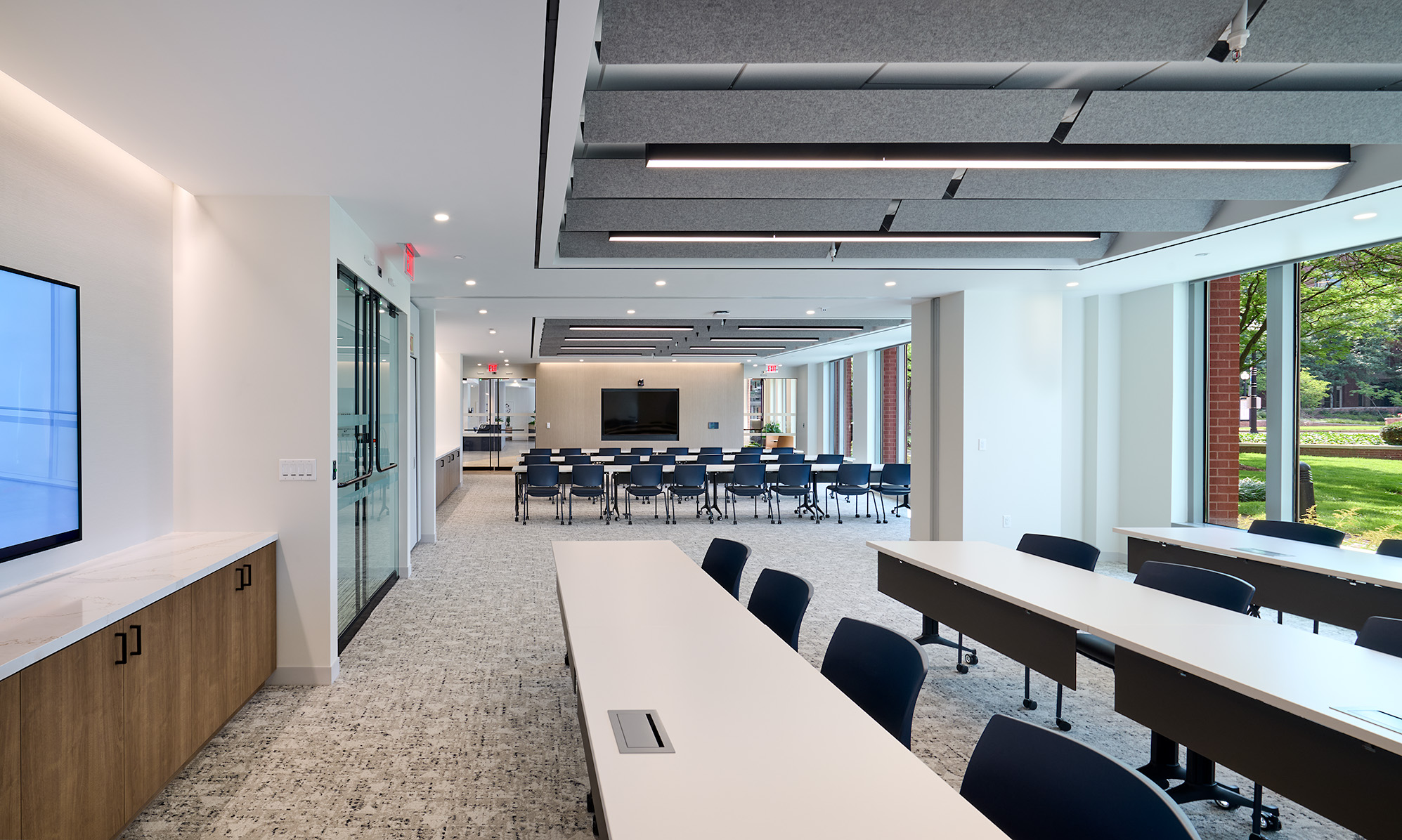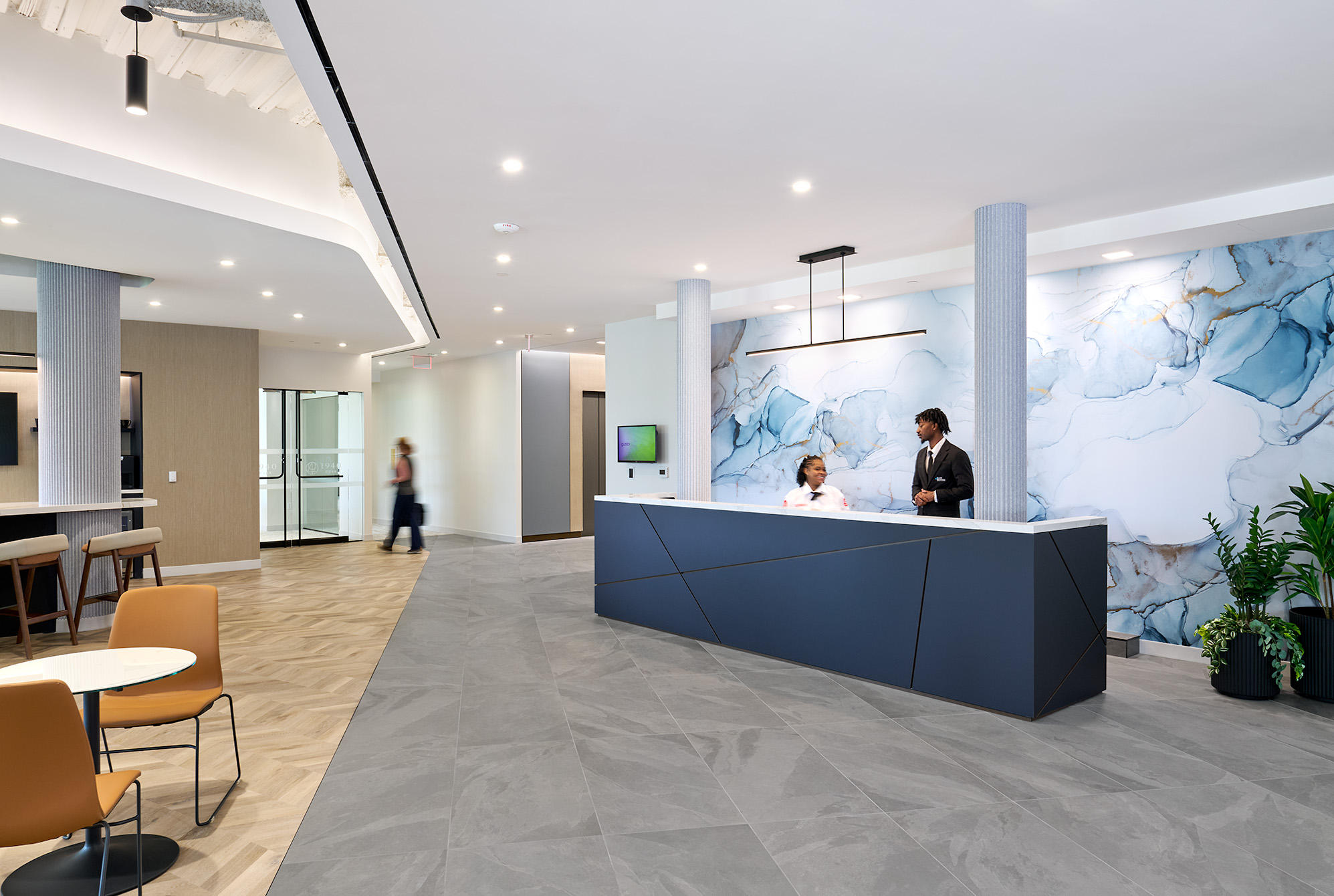 This project delivered a transformative renovation centered around the main lobby experience with the creation of a striking new entrance, contemporary reception area, and an inviting tenant lounge complete with a coffee bar. Two flexible conference rooms were constructed with operable partitions, allowing them to be seamlessly combined into a large training room, making the space ideal for hosting events, meetings, or other collaborative gatherings.