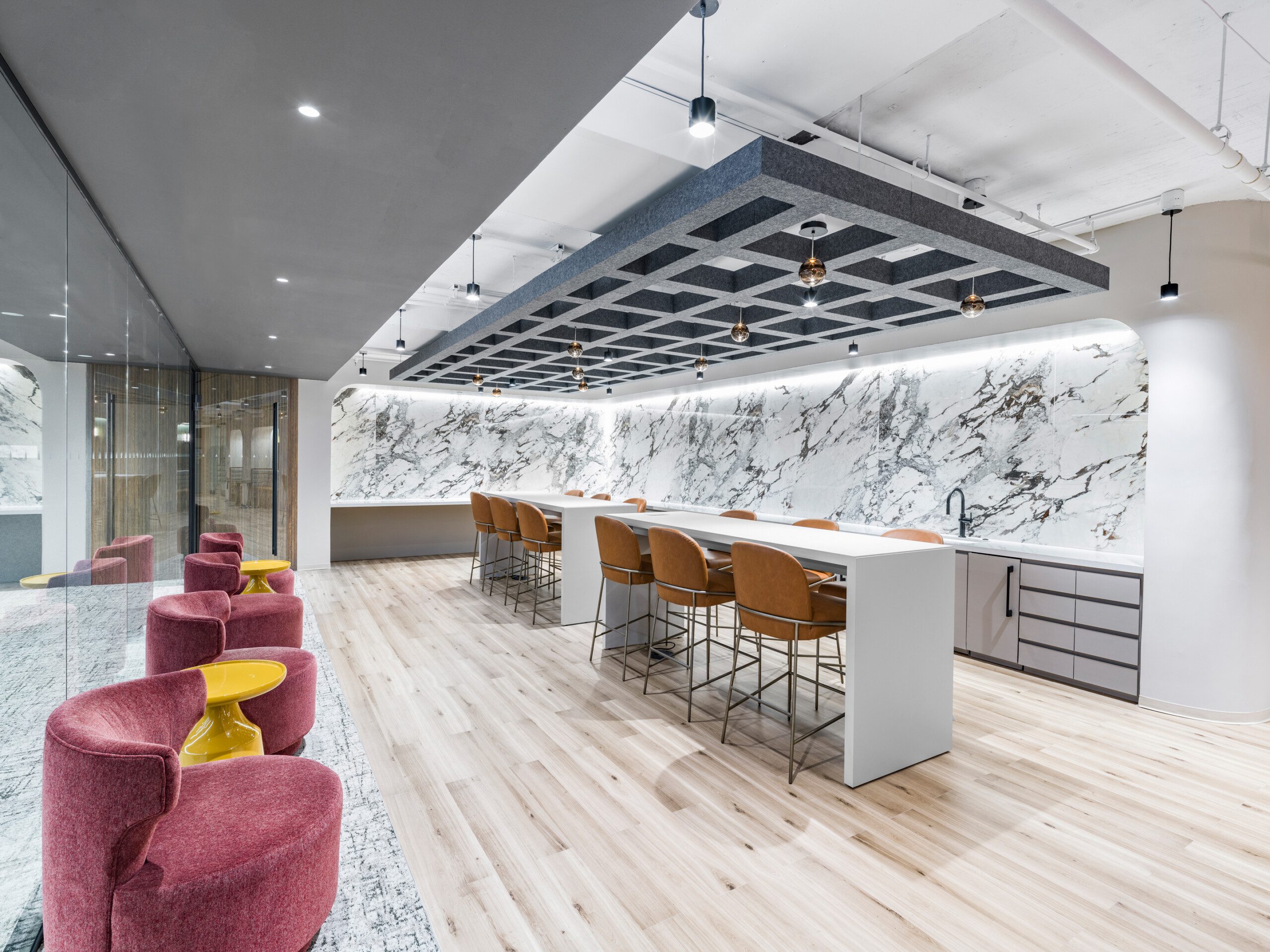 The project included the demolition of outdated partitions, finishes, and MEP systems. In their place, new acoustically treated partitions, high-end millwork, and modern lighting fixtures create a sophisticated and functional meeting space. The renovation also included the addition of a large and medium conference room, a lounge and breakout area, and a catering pantry.